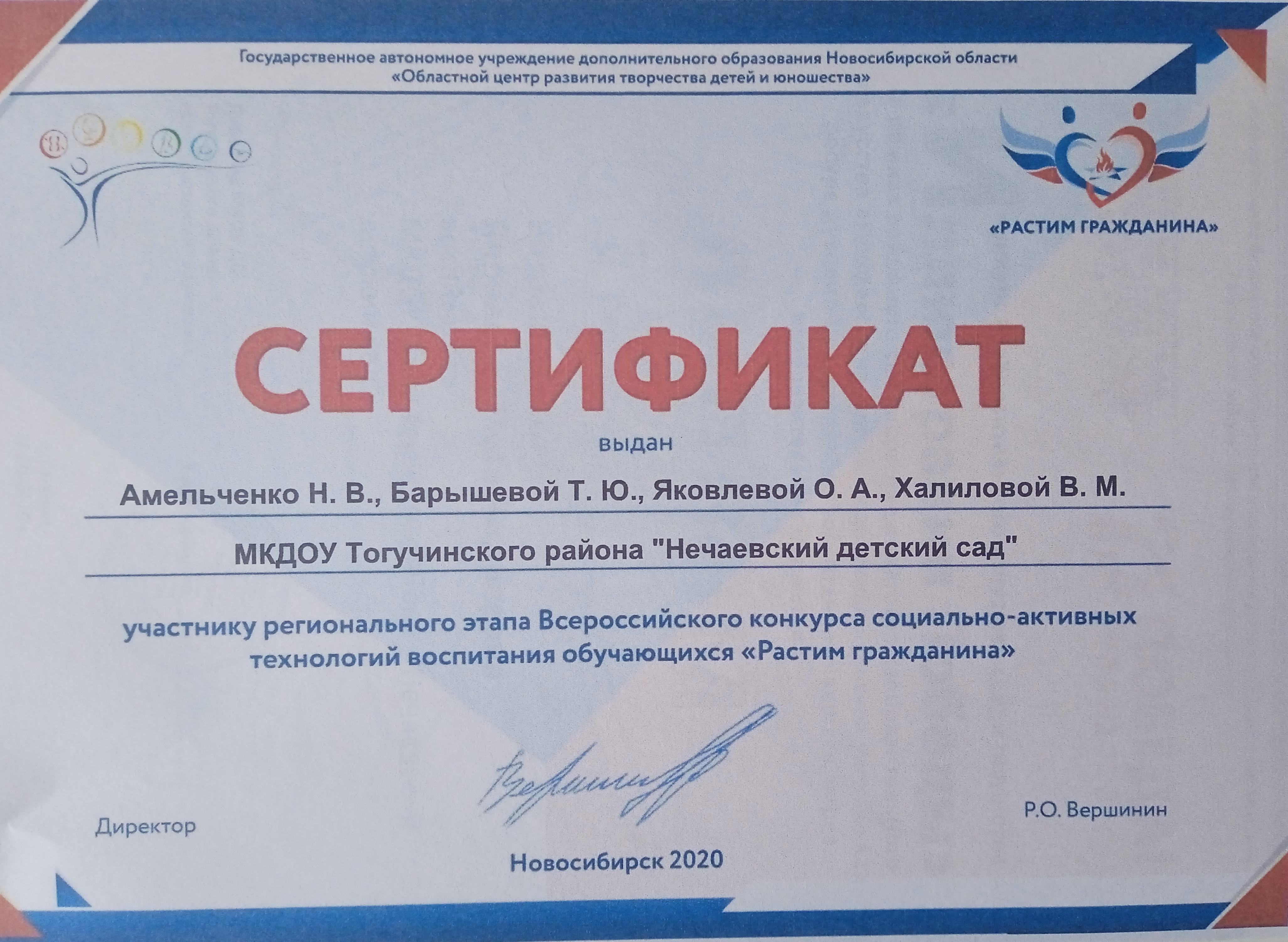 Сертификат участника регионального этапа Всероссийского конкурса социально-активных технологий воспитания обучающихся "Растим гражданина",г.новосибирск,2020г.