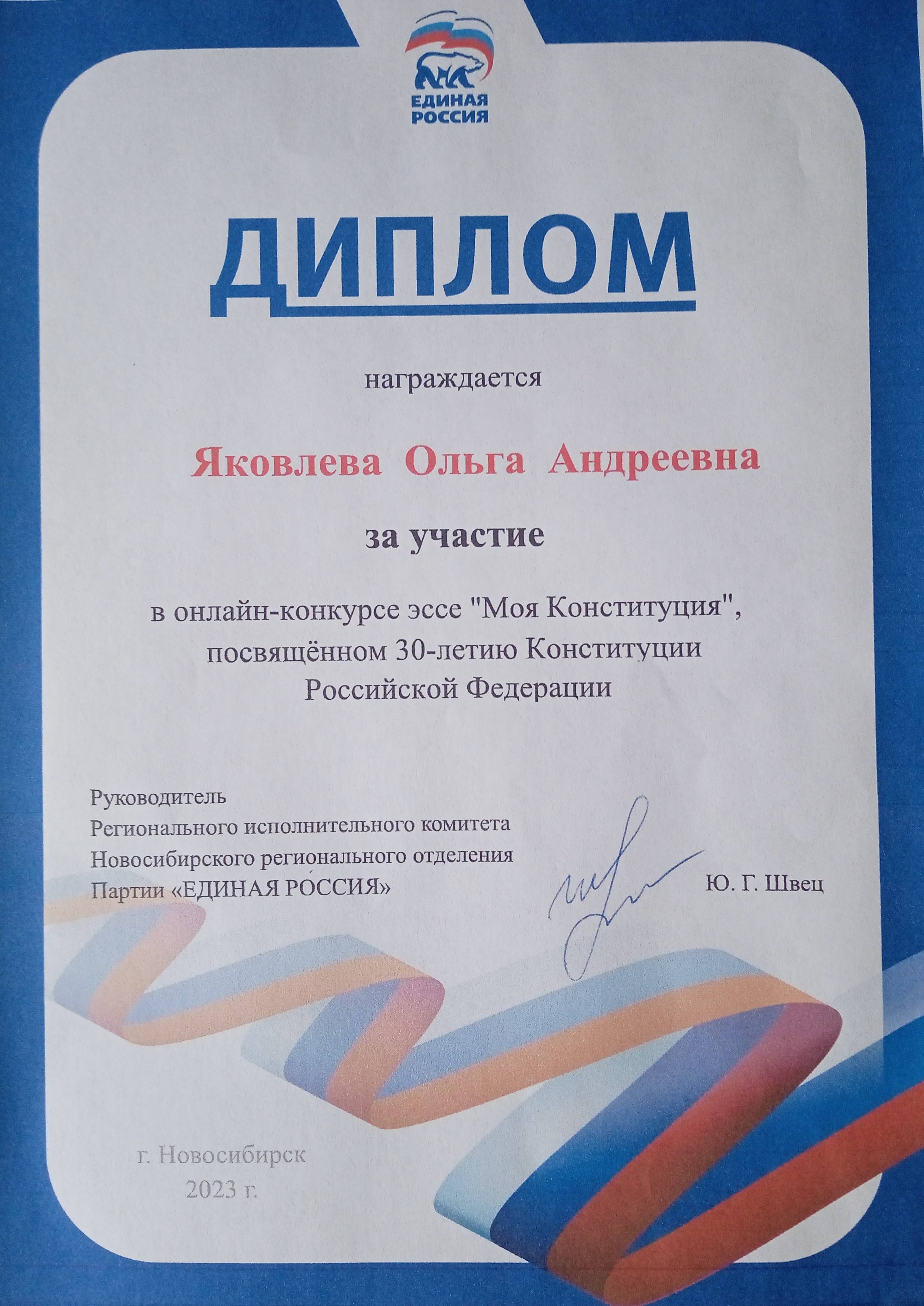 Диплом за участие в онлайн-конкурсе эссе "Моя Конституция" посвященном 30-летию Конституции РФ, г.Новосибирск, 2023г.