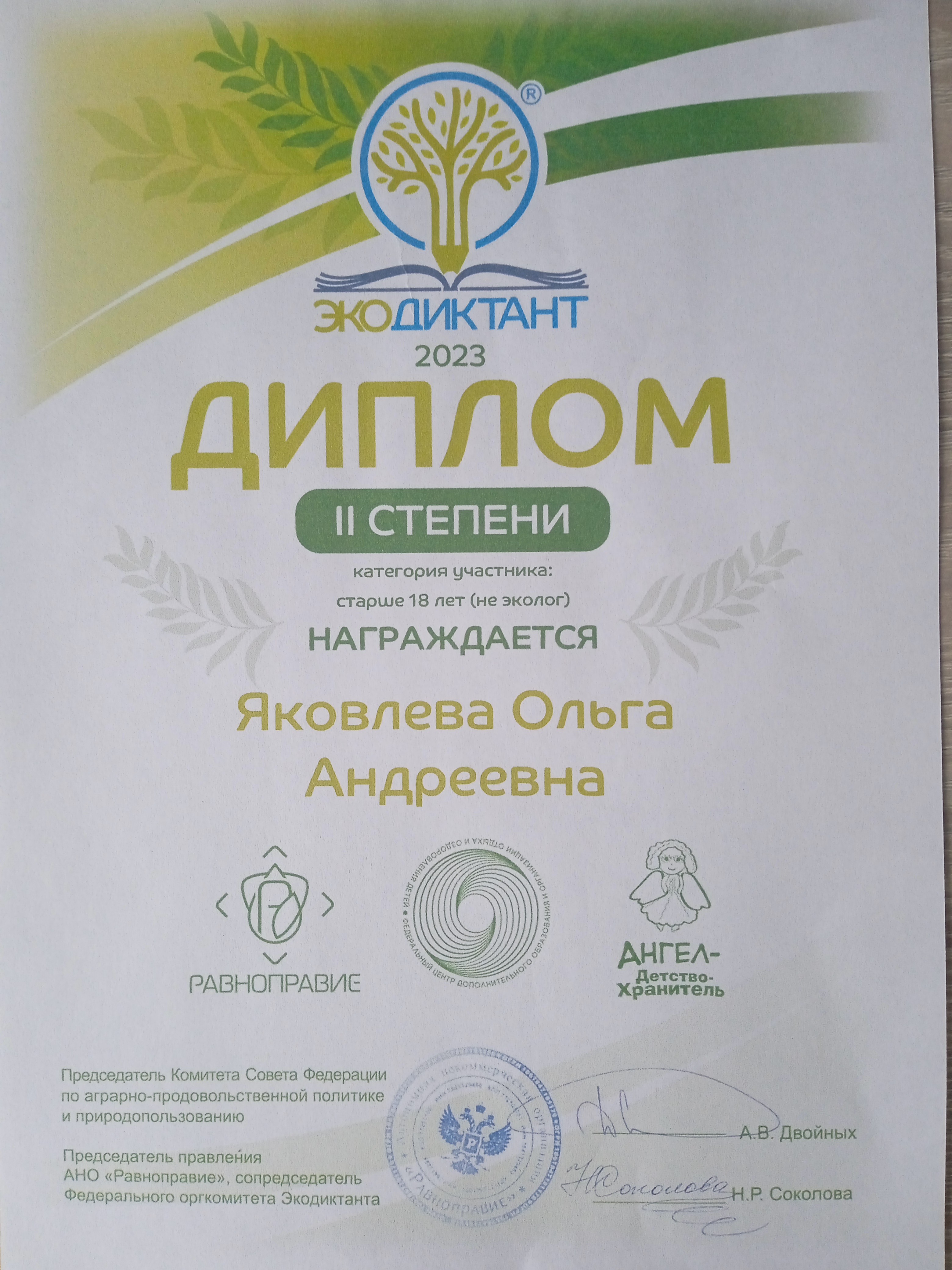 Диплом 2 степени "Экодиктант 2023",категория"не эколог", 2023г.