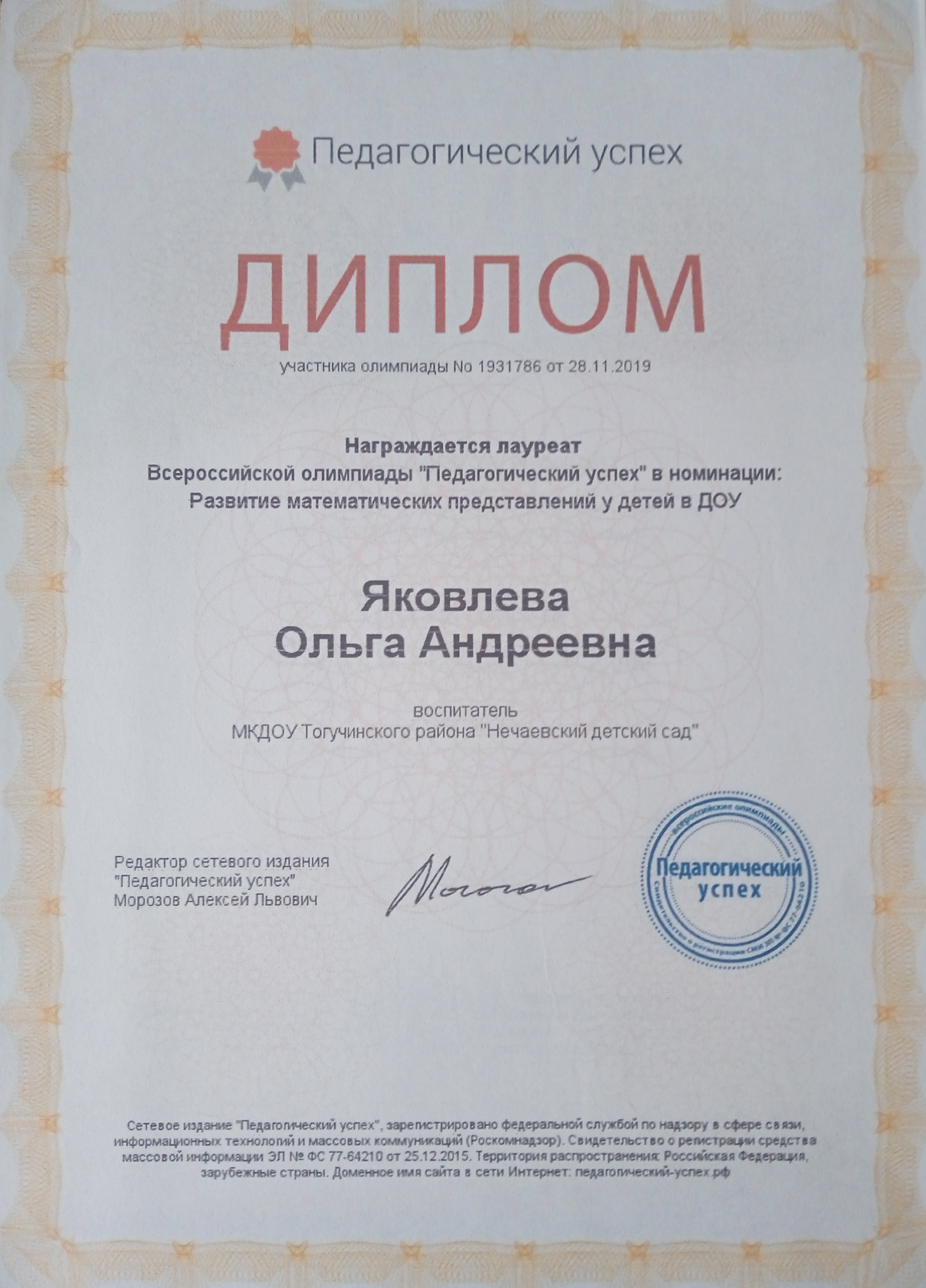 Диплом лауреата всероссийской олимпиады "Педагогический успех" в номинации "Развитие математических представлений у детей ДОУ", 2019г