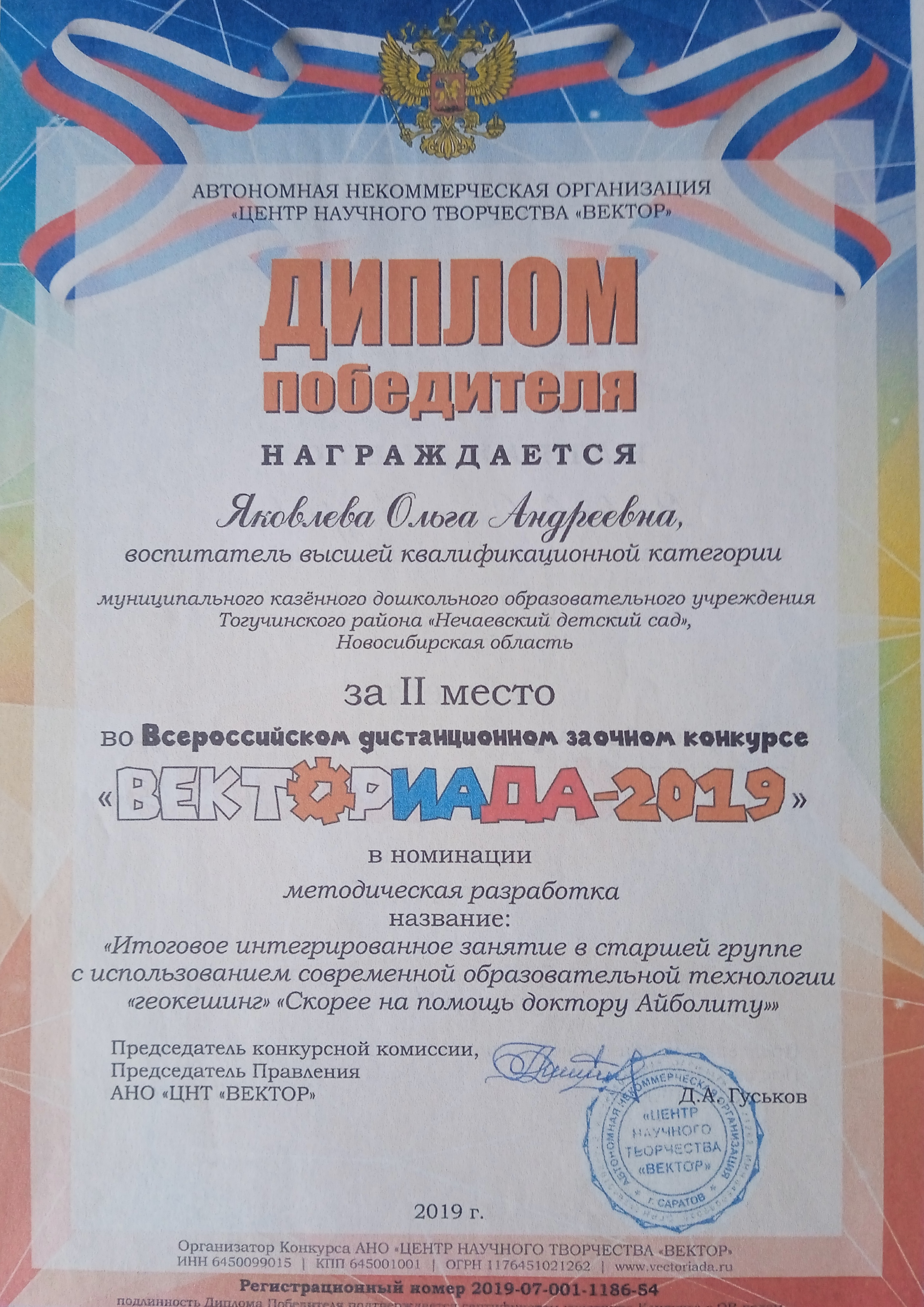 Диплом победителя за 2 место всероссийского дистанционного заочного конкурса "Векториада 2019" в номинации "методическая разработка- итоговое интегрированное занятие в старшей группе с использованием современной образовательной технологии "геокешинг" на тему "Скорее на помощь доктору Айболиту". 2019г