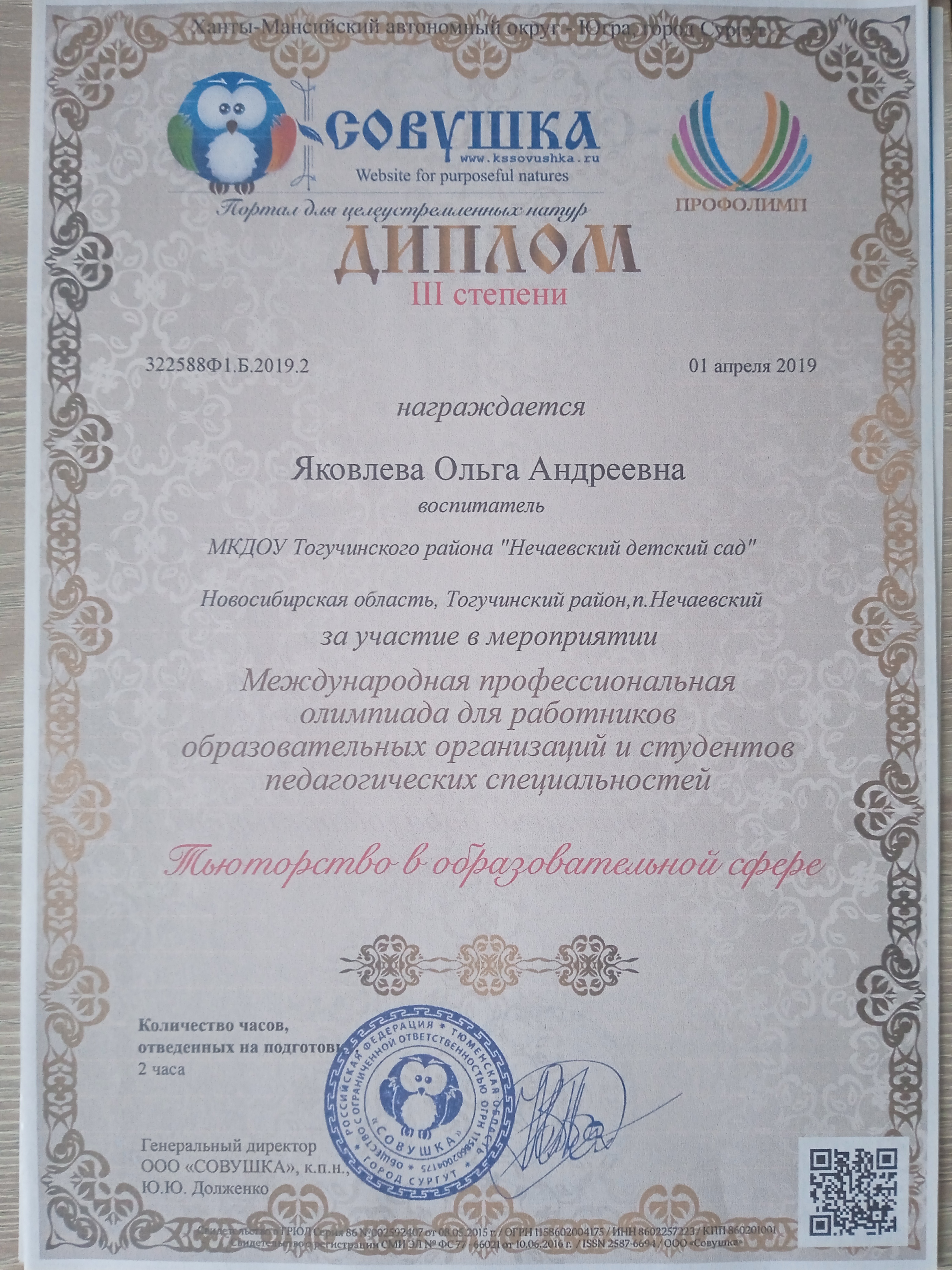 Диплом 3 степени в Международной профессиональной олимпиаде для работников образовательных организаций и студентов педагогических специальностей "Тьюторство в образовательной сфере", 2019г.