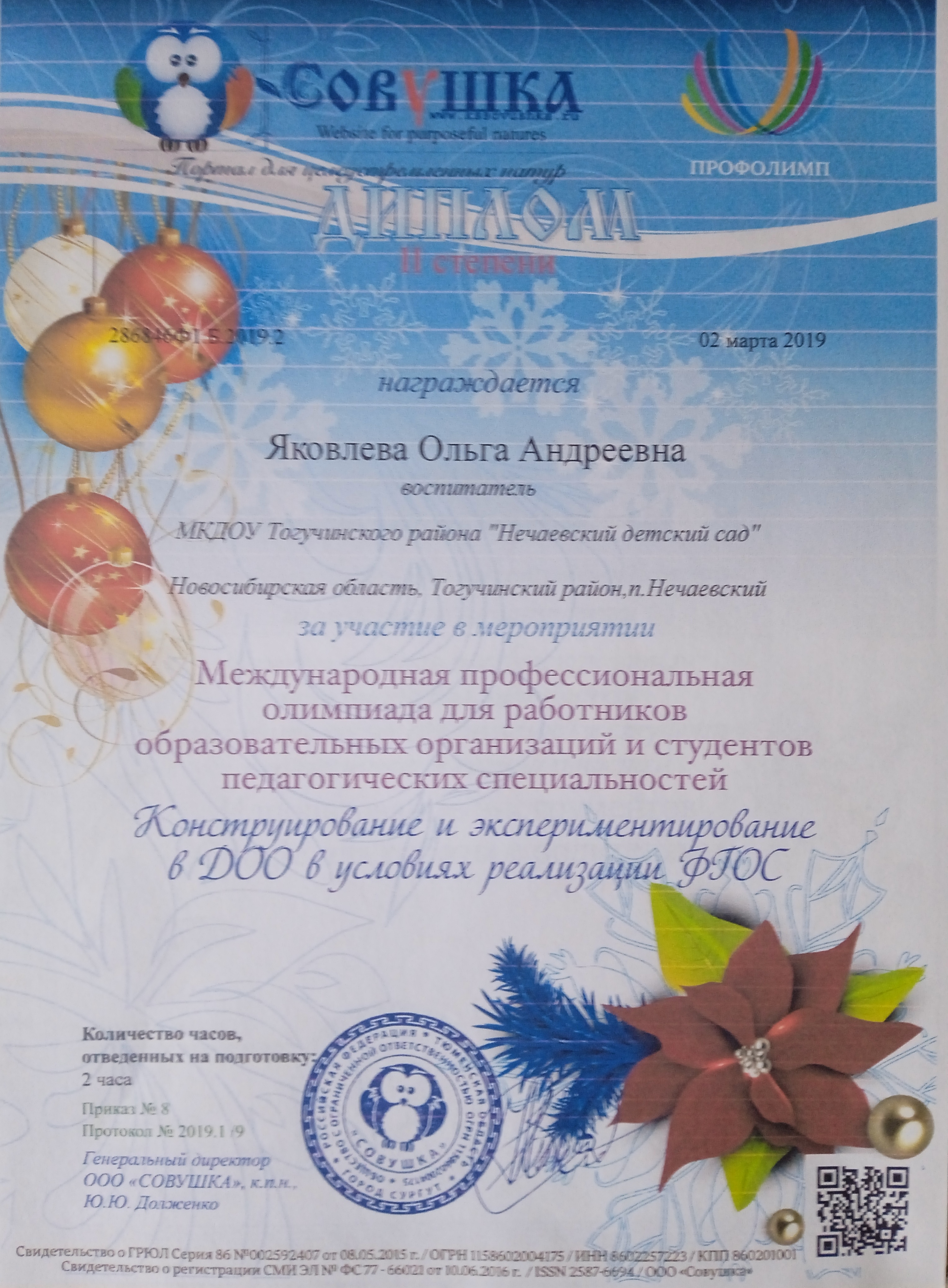 Диплом 2 степени в Международной профессиональной олимпиаде для работников образовательных организаций и студентов педагогических специальностей"Конструирование и экспериментирование в ДОО в условиях реализации ФГОС", 2019г.